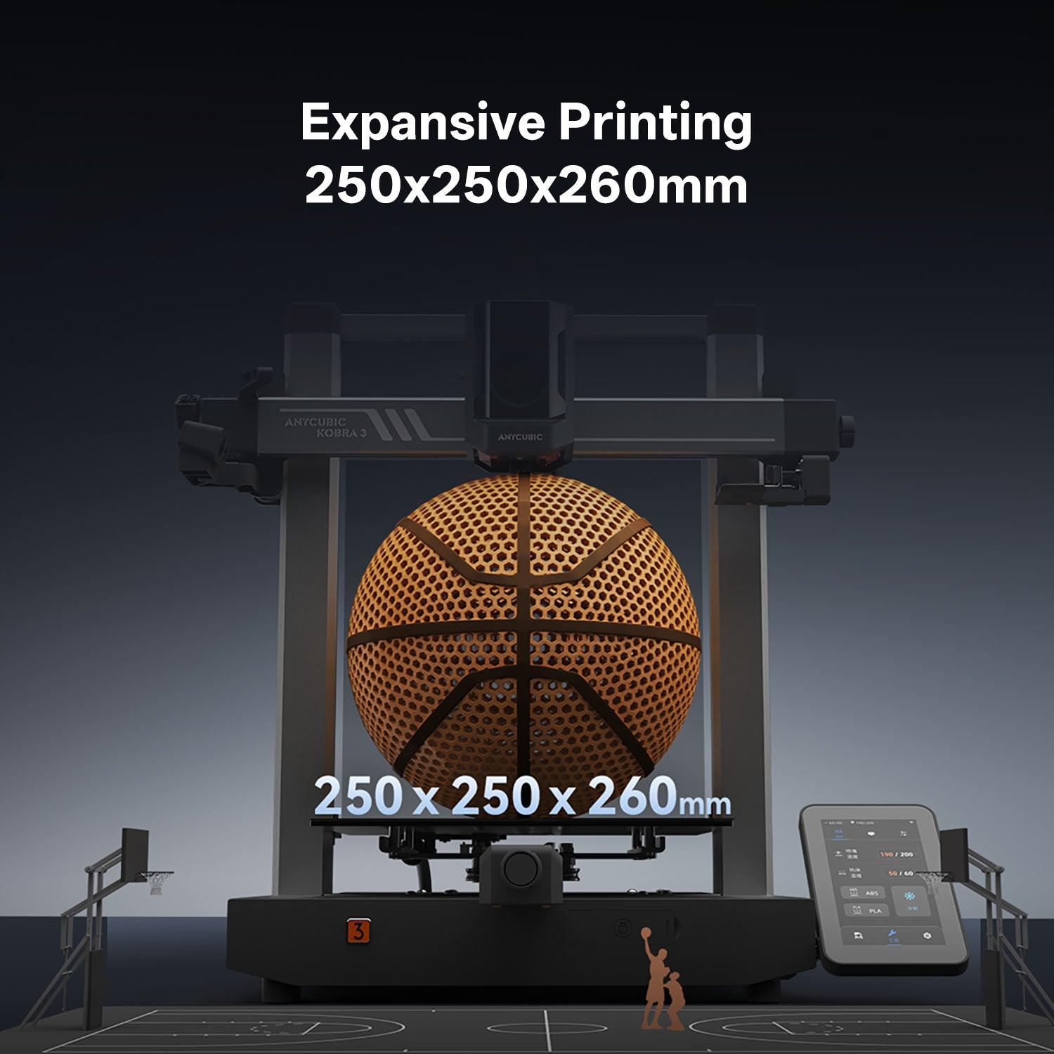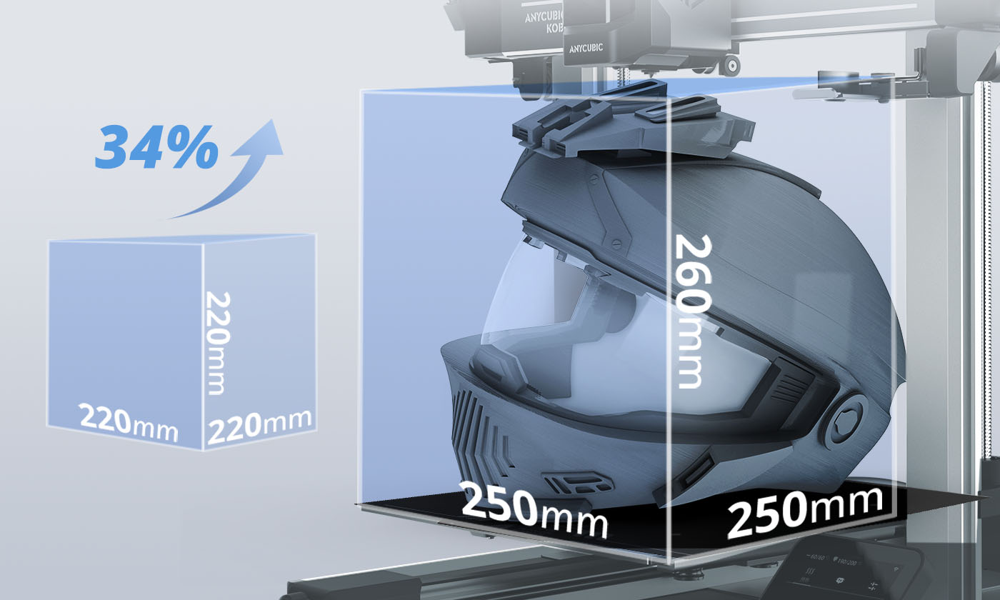 The Kobra 3 features printing sizes up to 250 x 250 x 260mm, with a maximum printing volume of 4.29 gal (16.25L), increased by a whopping 34% compared to previous 3D printers.