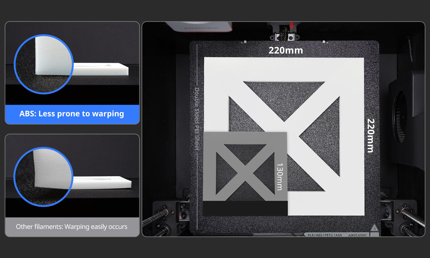 Anycubic ABS offers superior printability by minimizing warping caused by thermal stress during the printing process. It enables a 220mm × 220mm anti-warping print area with a heated bed at 100°C.