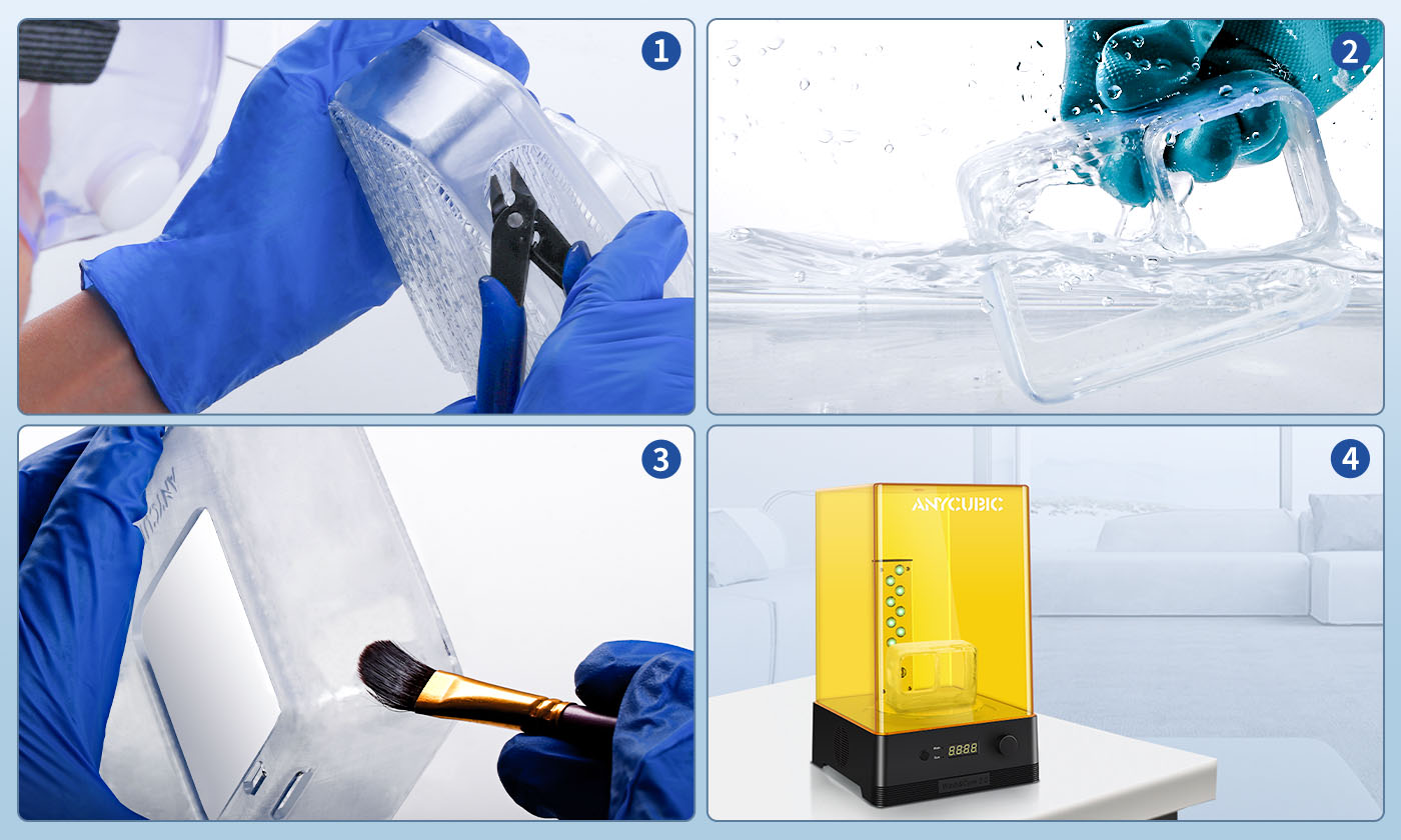 B. Submerge the model in the cleaning solution, rinse or ultrasonically wash, then take out and drain; ANYCUBlC Wash and Cure machines are suggested to ensure better effect.