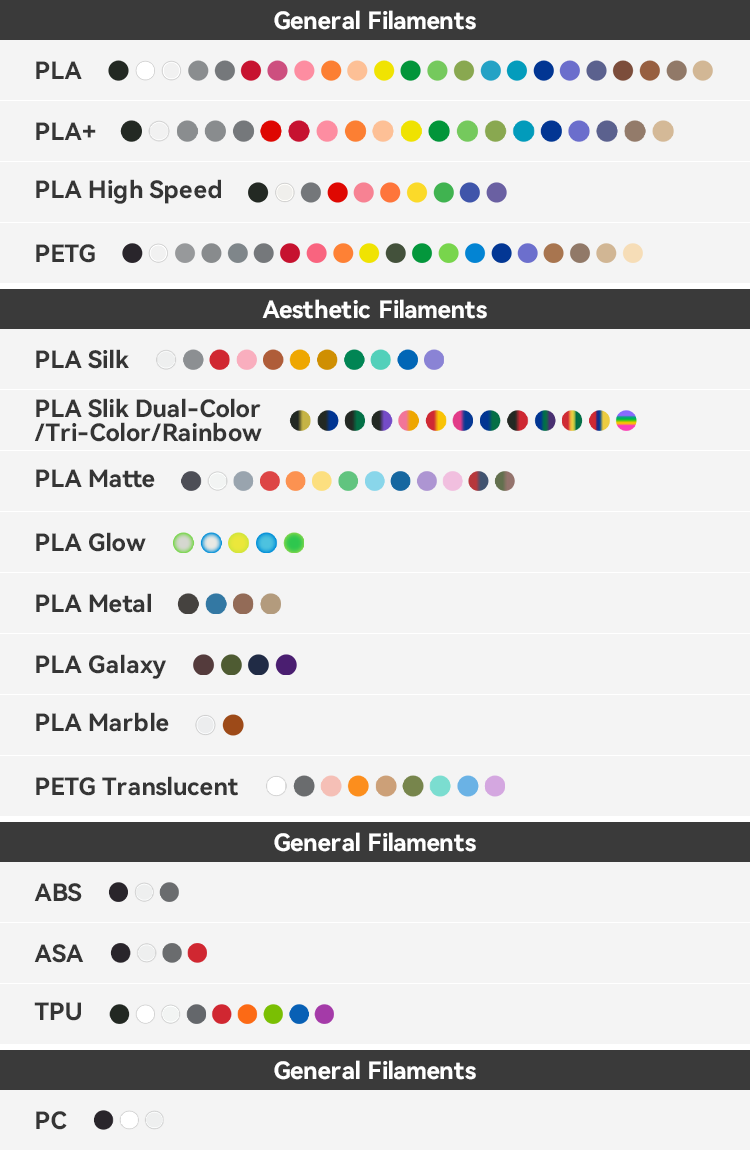 Compared to standard PLA filaments, the high-speed PLA filaments boast enhanced fluidity and better cooling effect, ensuring smooth and consistent feeding for filaments after melting, and rapid model cooling and shaping.