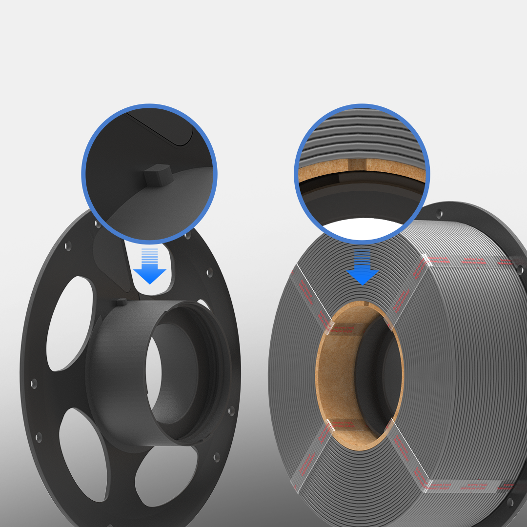 The reusable filament spool incorporates a threaded connection system engineered for enhanced stability when paired with spool-free filaments. This design significantly reduces the risk of entanglement, filament scattering, and operational errors.