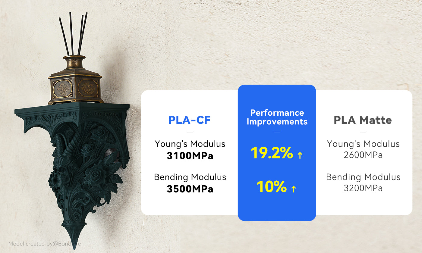 PLA-CF offers significantly higher rigidity and stiffness due to carbon fiber reinforcement. Typical tensile strength ranges from 41-47 MPa, with a flexural modulus increase of 22% over standard PLA. This makes it ideal for structural applications requiring dimensional stability under load.