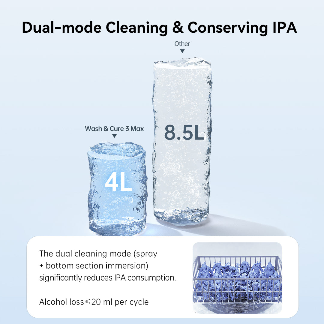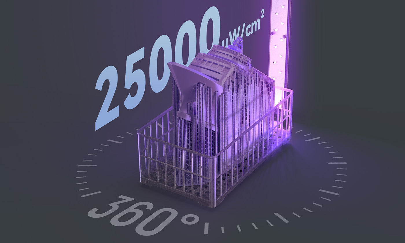 Featuring a 360° rotating curing platform with a maximum power density of 25,000 μW/cm² at an irradiation distance of 18 cm, Wash & Cure 3 Max ensures an efficient curing effect.